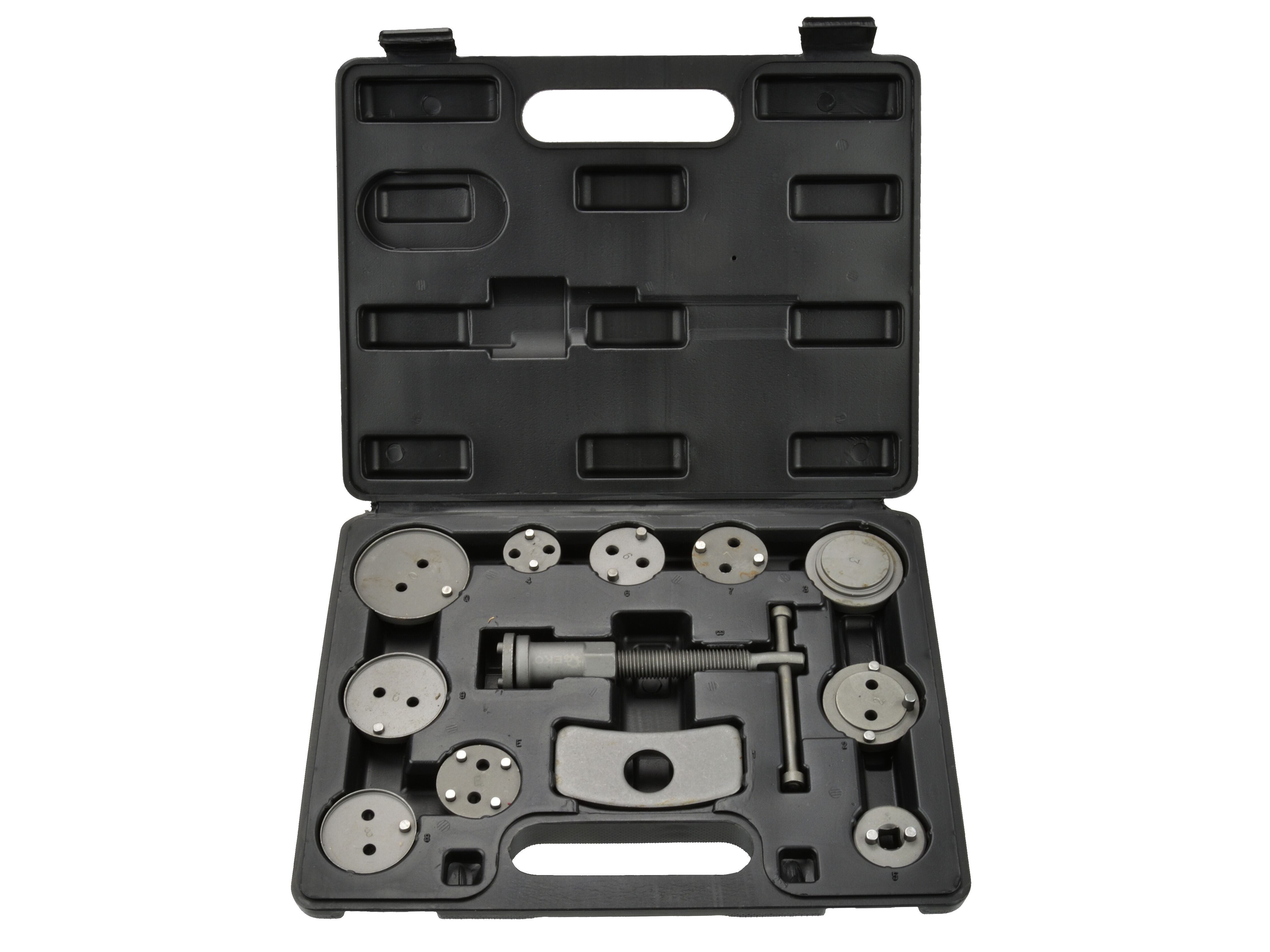 Profesionálna 12 dielna sada na zatlačenie piestov bŕzd, nevyhnutná pre opravu vozidiel vybavených kotúčovými brzdami.