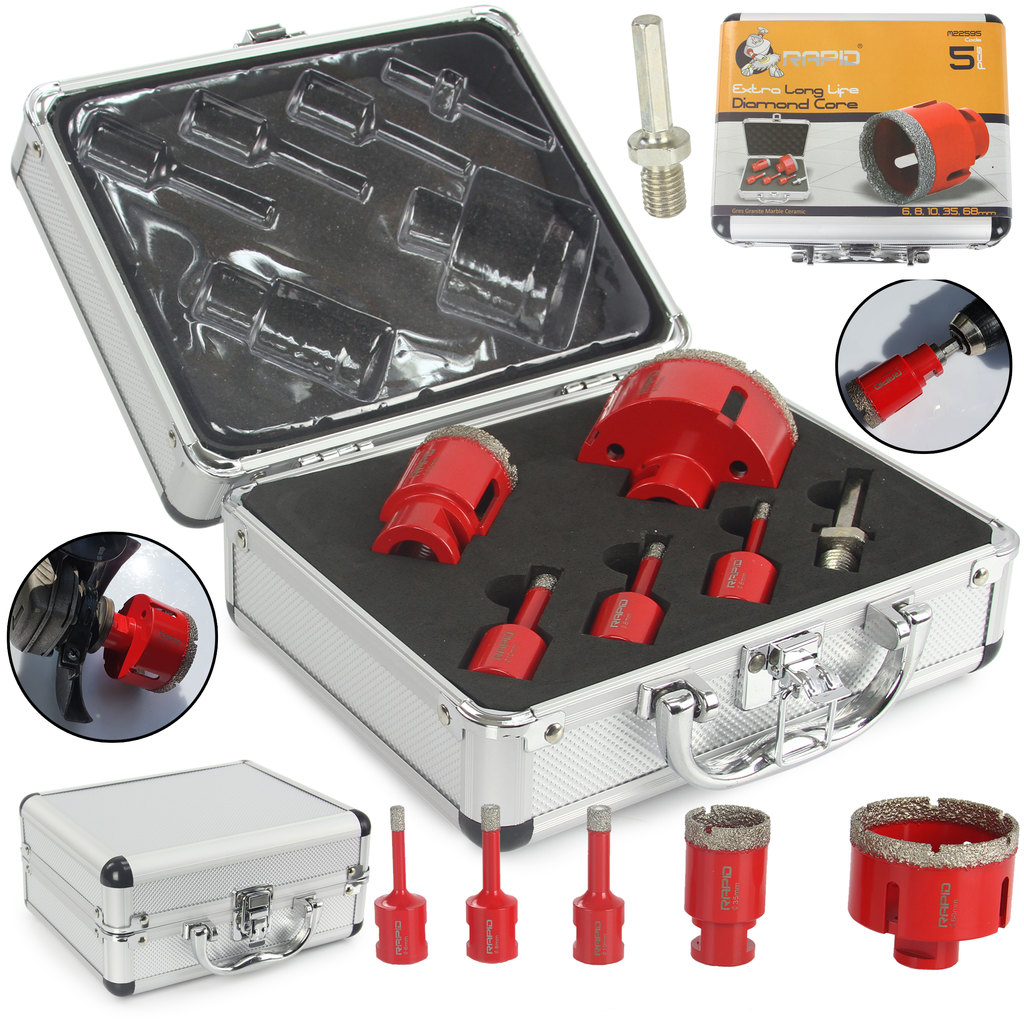 Sada diamantových vykružovákov s priemerom 6 až 68 mm. Vybavený montážnym závitom M14 pre montáž do uhlových brúsok a adaptérom pre vrtáky.