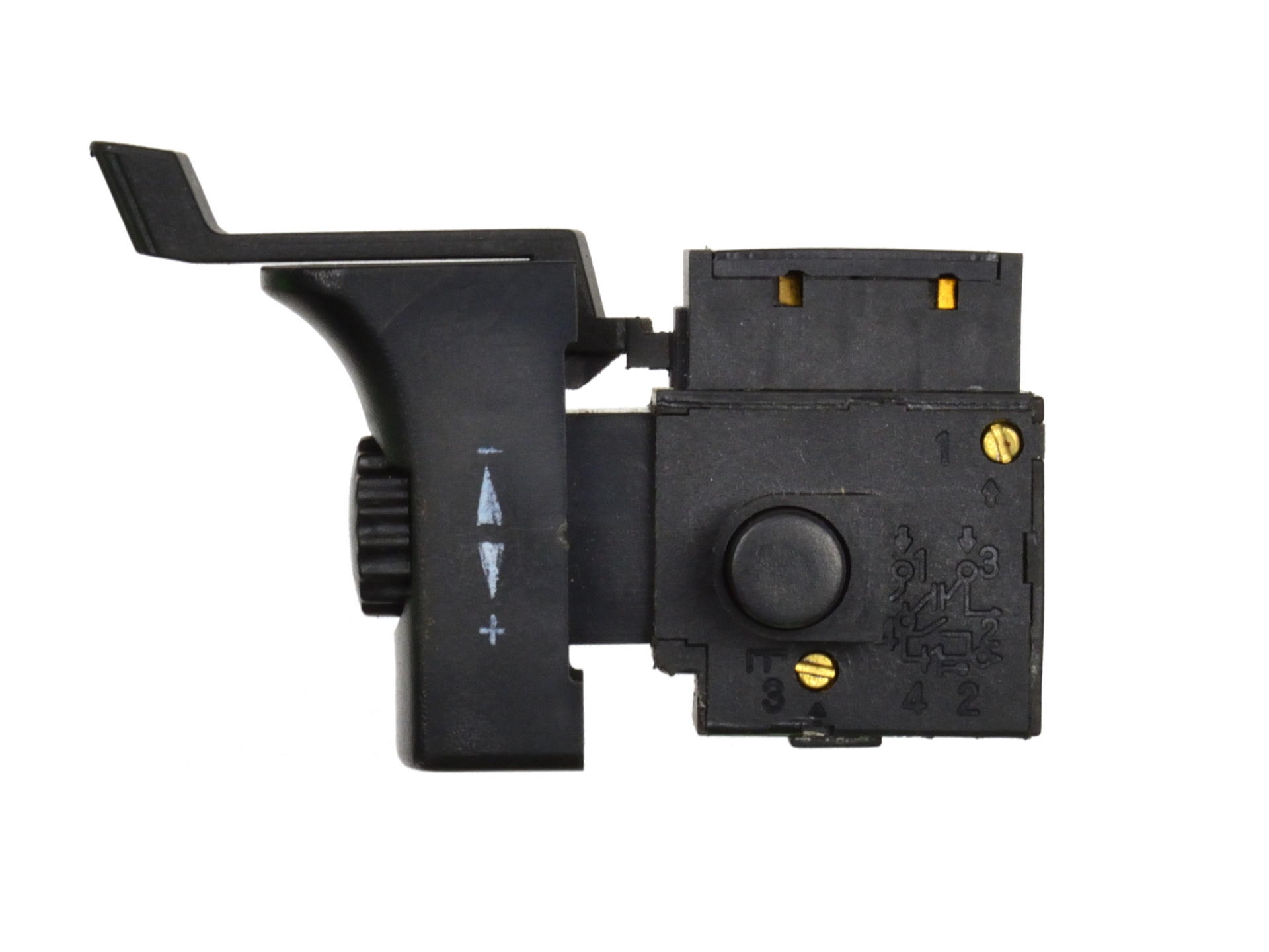Tlačidlový prepínač s reguláciou otáčok, zmenou smeru otáčania v smere hodinových ručičiek a blokovaním prepínača v trvalo zapnutej polohe.