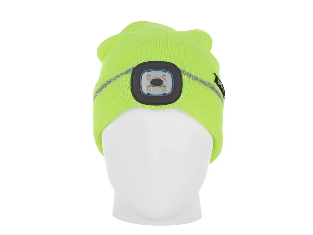 Žltá zimná čiapka je vybavená reflektormi a LED lampou so svetelným výkonom 150 lumenov so vstavanou batériou. Toto je praktické a funkčné riešenie, ideálne na zimné večery a noci.