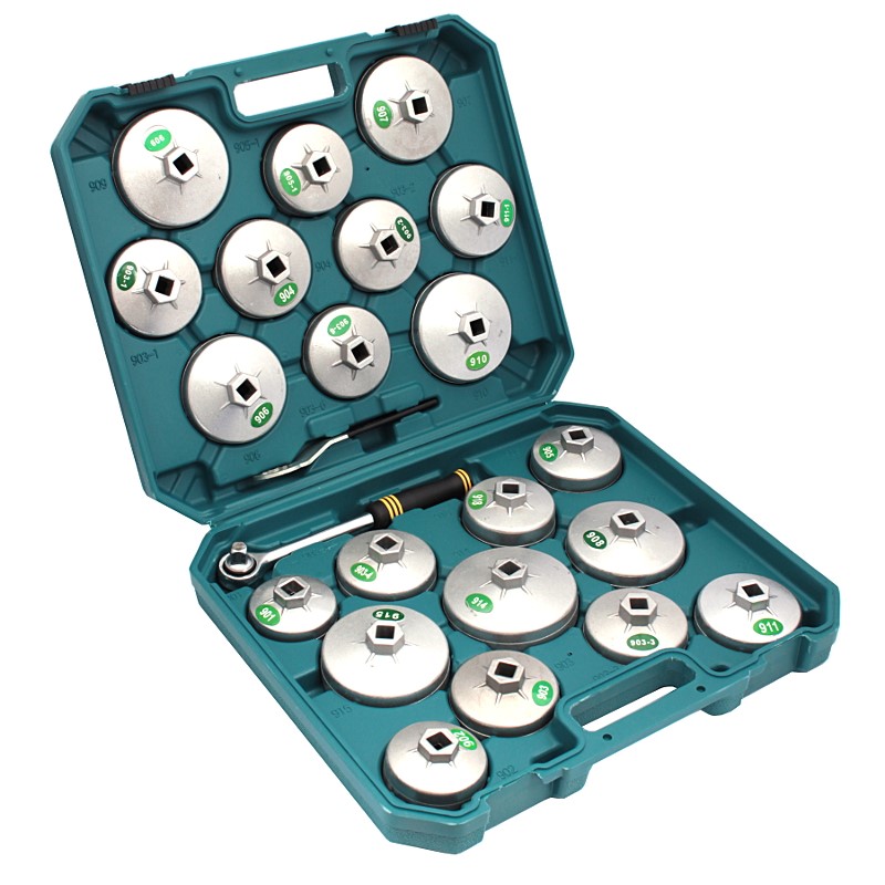 Sada nástrčných kľúčov na odskrutkovanie a utiahnutie olejových filtrov. Pasujú na väčšinu filtrov dostupných na trhu. Veľkosti vyrazené na puzdre a na každom kľúči umožňujú rýchly výber vhodného filtra a organizácie. Zabalené v pohodlnom kufríku na uskladnenie.