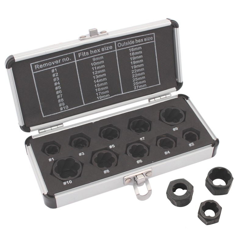 Sada 10 hlavíc na odskrutkovanie poškodených skrutiek alebo matíc. Tvar objímok umožňuje ich nalepenie na odskrutkovaný prvok. Môžu byť použité s otvorenými alebo očkovými kľúčmi. Balené v elegantnom kufríku s vnútorným prelisom pre jednoduché skladovanie.