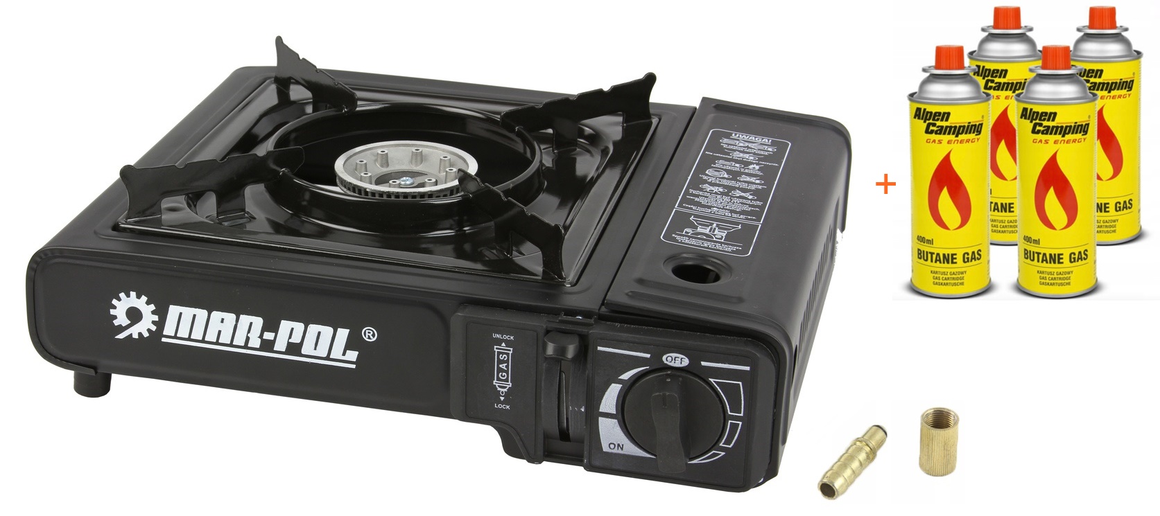 MAR-POL M90016 Turistický prenosný varič plynový 2v1 na kartuš a plynovú fľašuskladom28,80 EUR/ ks23,41 EUR bez DPH